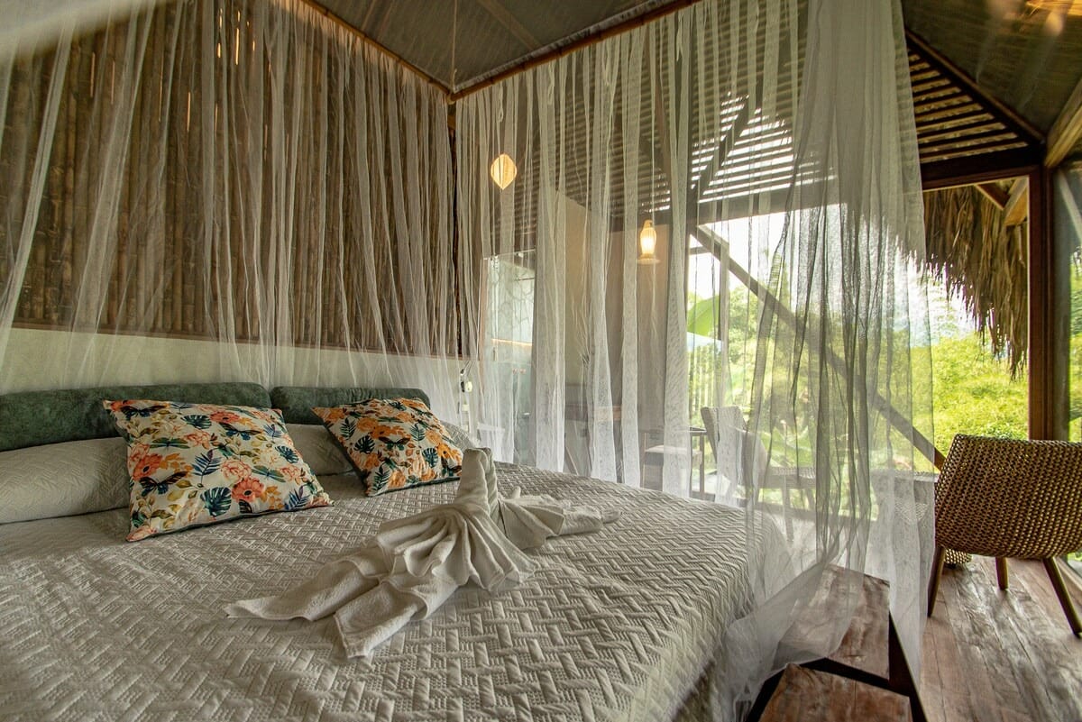 Suspended above the lush landscape, the Birds Eye View Cabana offers an intimate connection with the beauty of the Colombian Andes. From your private terrace, watch clouds drift across the hillsides and listen to the soft symphony of birds welcoming the morning.